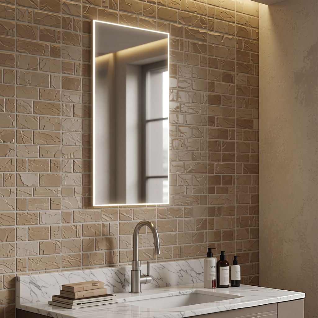Delicate, yet impactful, It’s impressive height is complemented by its ultra-slim frame for a finely balanced statement piece. The precision frame of LED illumination provides subtle radiance, while wave-switch activation offers an intuitive experience that heightens the overall sense of luxury. For total ease, all electrical components are contained within the frame, so there is no need to recess or conceal any elements within the supporting wall.
