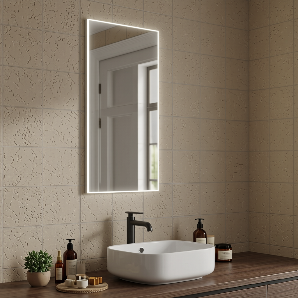 Delicate, yet impactful, It’s impressive height is complemented by its ultra-slim frame for a finely balanced statement piece. The precision frame of LED illumination provides subtle radiance, while wave-switch activation offers an intuitive experience that heightens the overall sense of luxury. For total ease, all electrical components are contained within the frame, so there is no need to recess or conceal any elements within the supporting wall.